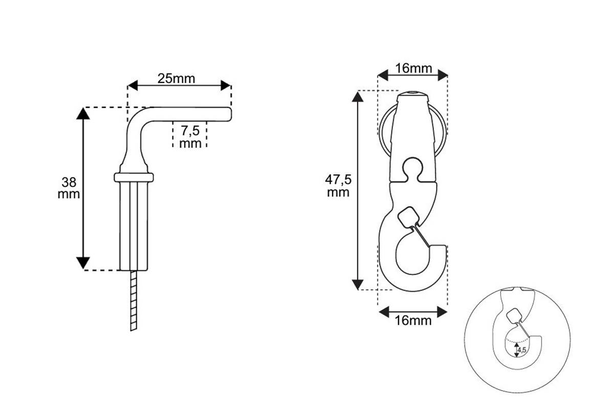 La longueur de l'œil est de 25 mm et le trou est de 7,5 mm. Le crochet a une longueur de 47,5 mm, une largeur de 16 mm et une ouverture de 4,5 mm.