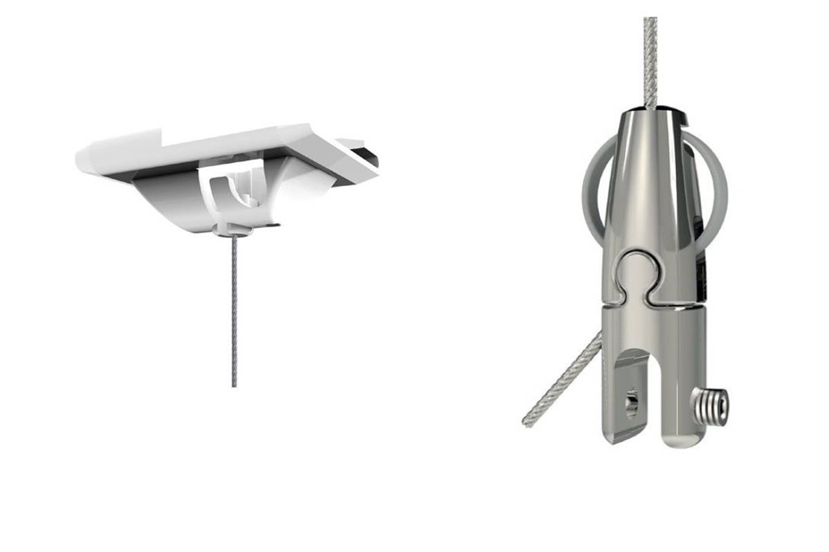 L'ensemble contient 1 câble en acier de Ø1,5 mm avec clip pour plafond suspendu et 1 pince pour planche. La pince pour planche a une longueur de 47,5 mm et une largeur de 16 mm.