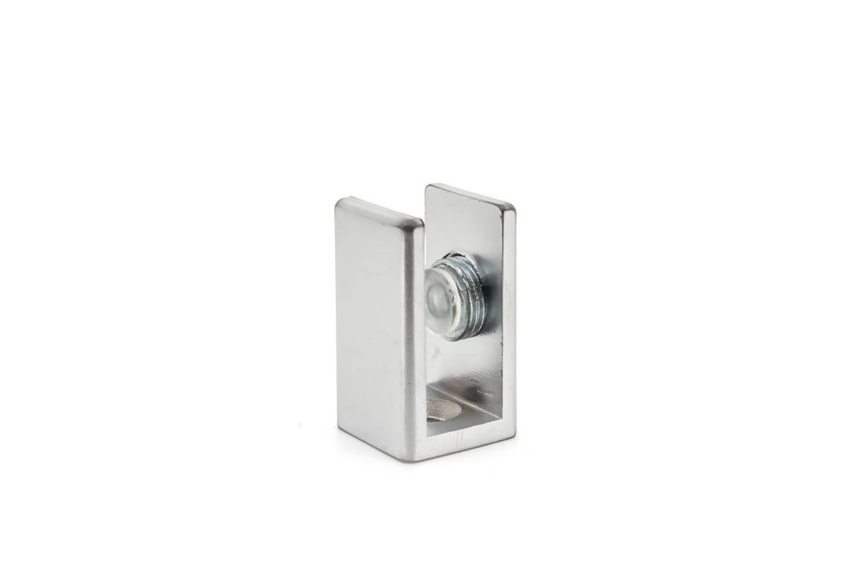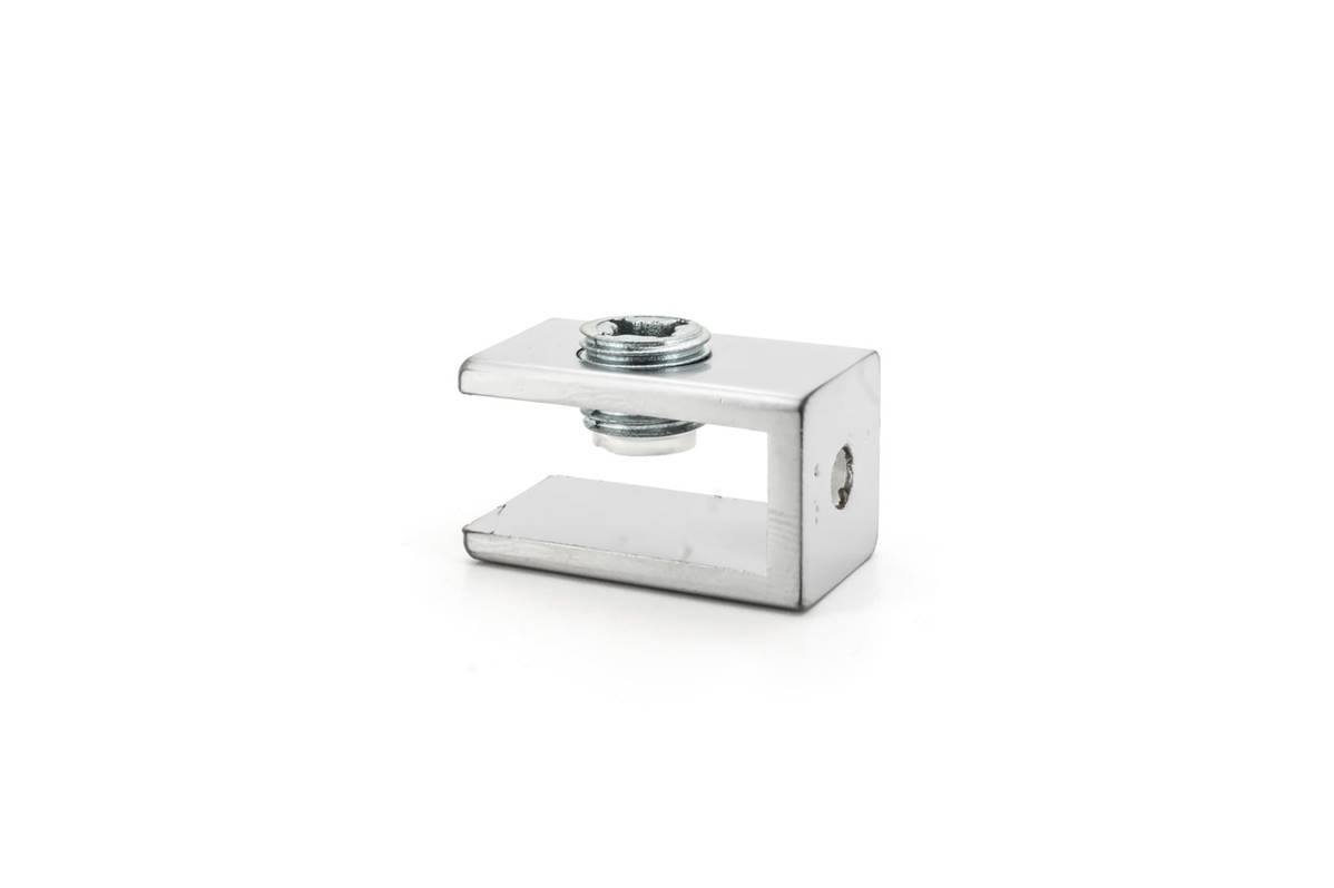 Cette pince est adaptée pour fixer des plaques de verre perpendiculairement au mur, entre autres.