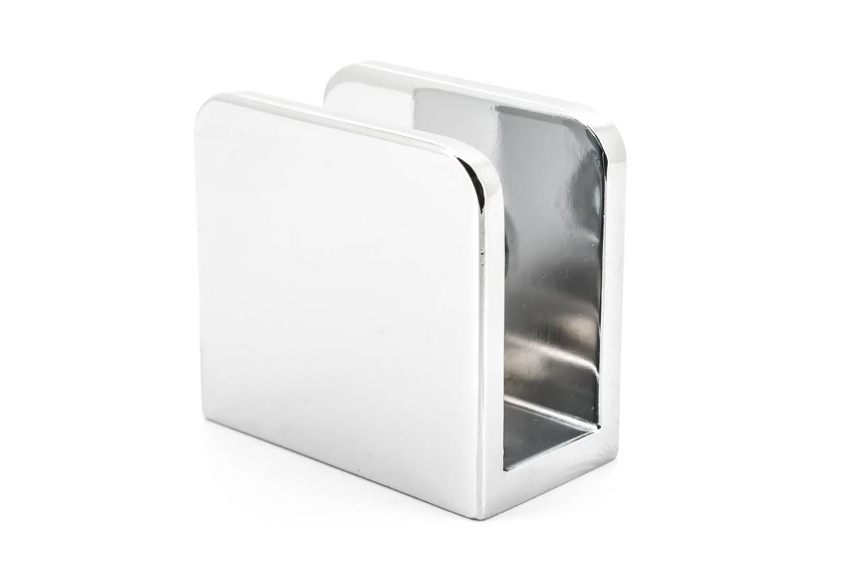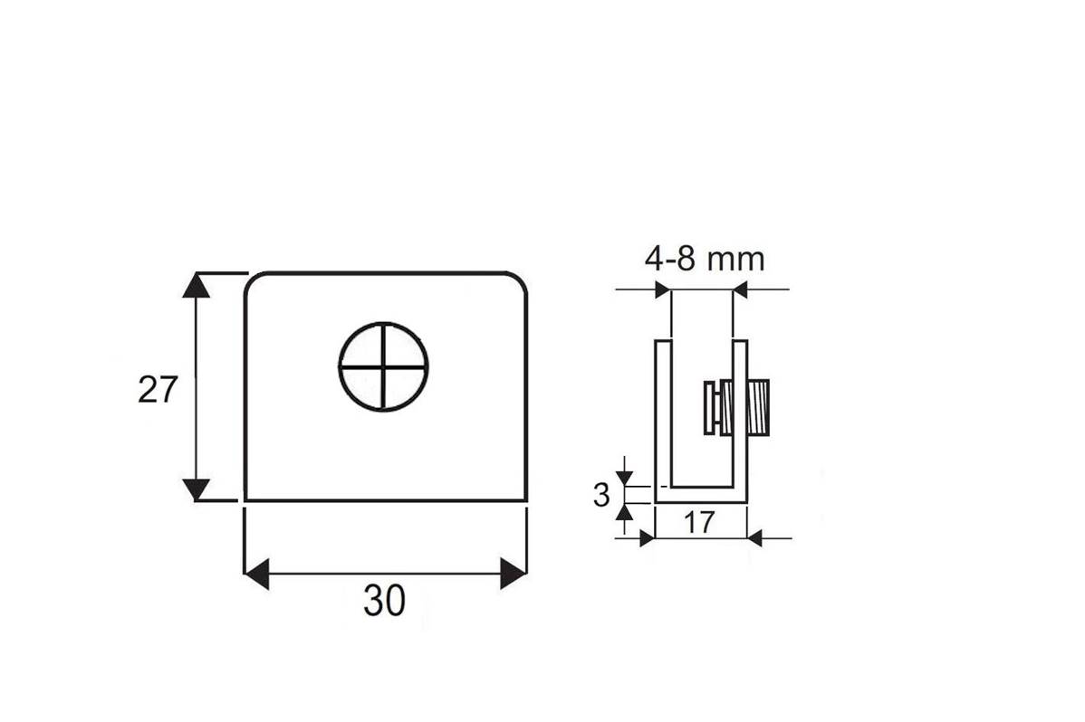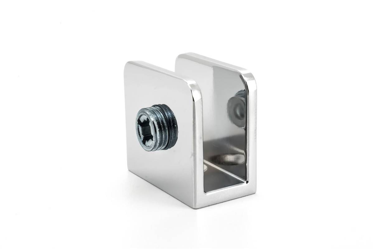 Cette pince est adaptée pour fixer des plaques de verre perpendiculairement au mur, entre autres.